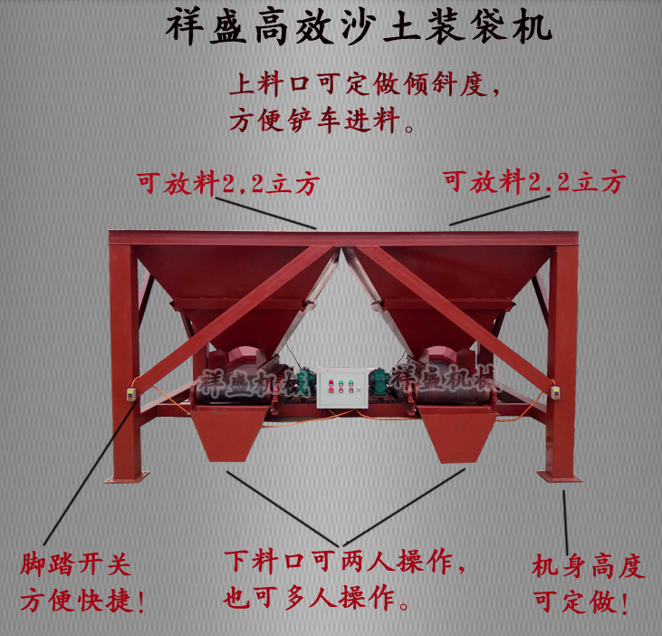 沙土、沙子装袋机主要用于销售沙土方便运输不撒漏,代替人工装袋为您省时省力节约成本,本机为一键式操作出沙量可调25-50公斤随意调节方便简单。大容量进料斗适用于各型号铲车进料方便。