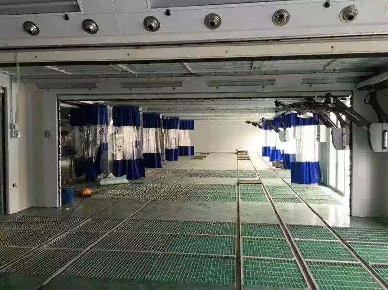 近年来干式喷漆房开始应用于大漆雾量的大型喷漆房, 形成了干式喷漆房取代湿式喷漆房的趋势。喷漆时, 室外新风由进风道进入, 经过新风过滤网、送风机、加热系统、亚***过滤网、送风道, 被送至均风室。过滤后的新鲜空气,由均风室以0.5m/s速度送入室体内, 将工件置入具有***风速的均流层中。喷漆室内的过喷漆雾被底部过滤装置去除, 喷涂过程中挥发的有机气体经环保装置过滤后, 在引风机的作用下经过排风筒排入大气。