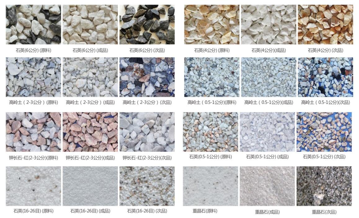 非金属矿:钾长石、石英石、滑石、磷矿、方解石、白云石、红柱石、萤石、蛭石、云母、膨润土、高岭土、重晶石、长石、石英、碳酸钙、鹅卵石、冰晶石、石榴子石、石灰石、锰矿石等.