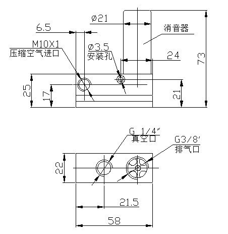 4. ***用排气管排气时,可用快速接头代替消声器安装在排气口上,安装排气管建议使用内径大于6mm的软管,长度在0.5-1.0米,使用过细的软管会影响真空发生器的性能。