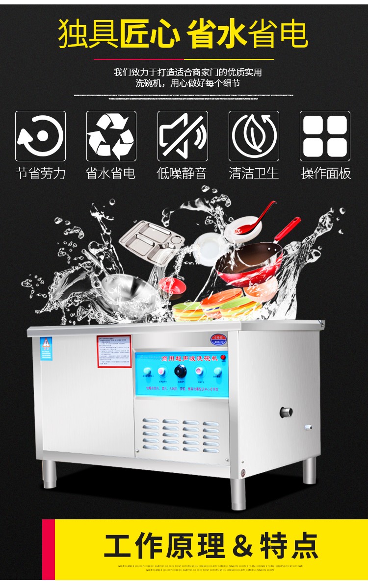 2.特点:该机装有自动除油除渣系统。当待洗餐具进入该系统时,在超声波无死角的清洗剥离状态下。利用浮力的原理,被清洗下的固体自动进入装渣槽,浮油、菜叶等漂浮体经过水刀顺废液排出口排出。确保清洗池内水质干净、可循环使用、餐具出水无二次污染。