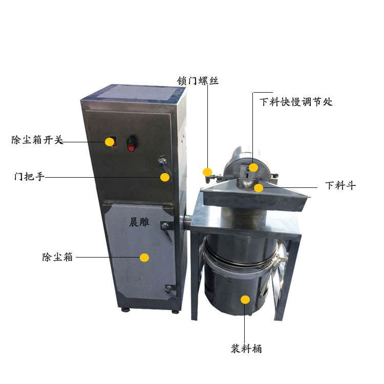 3、不同的型号,产量是不同的。机器越小,产量越低。再大的型号,也有产量的限制,注意控制投料量,原则上机器每分钟出粉多少,投料量也不得高于出粉量。投得多,出粉少,机器因为粉碎腔的物料太多造成电机负荷过大,如果出现电机转速减慢甚至不转的情况,应该马上关掉机器开关并且断掉总电源,再打开机盖,清理掉粉碎腔内的物料后,锁紧门盖后才能再次开机。